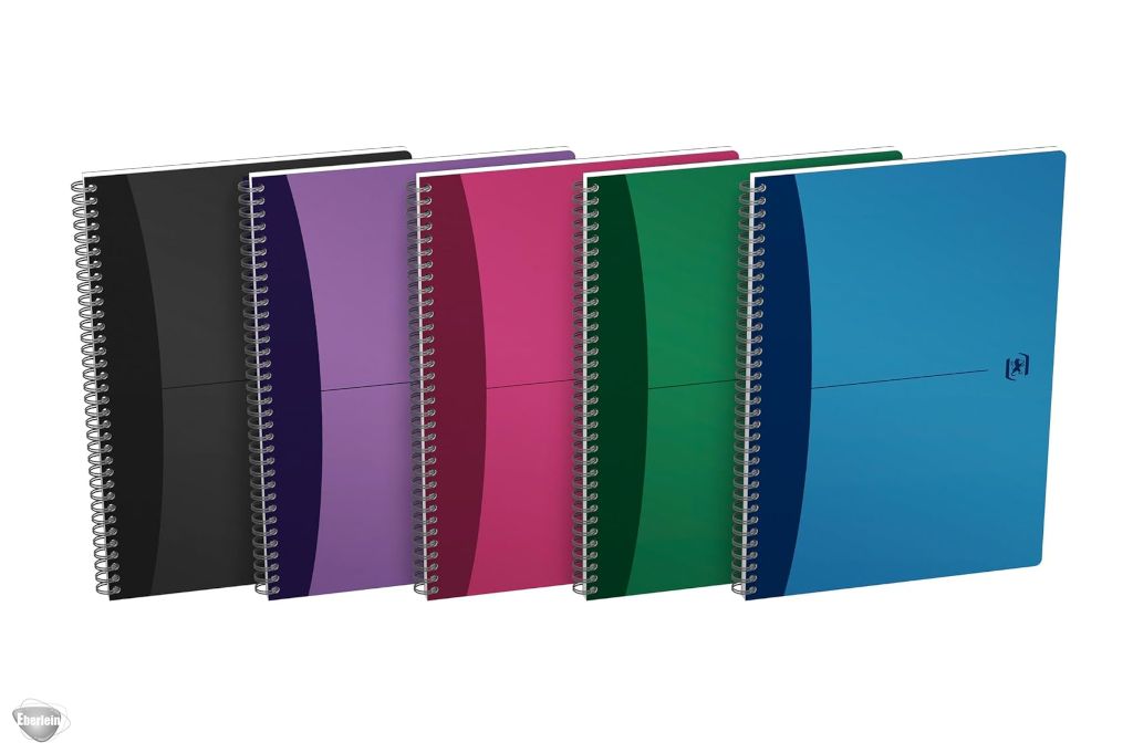 Spiralbuch Oxford Office A4. Auswahl zwischen fünf verschiedenen Farben: Schwarz, Rot, Lila, Grün und Blau.