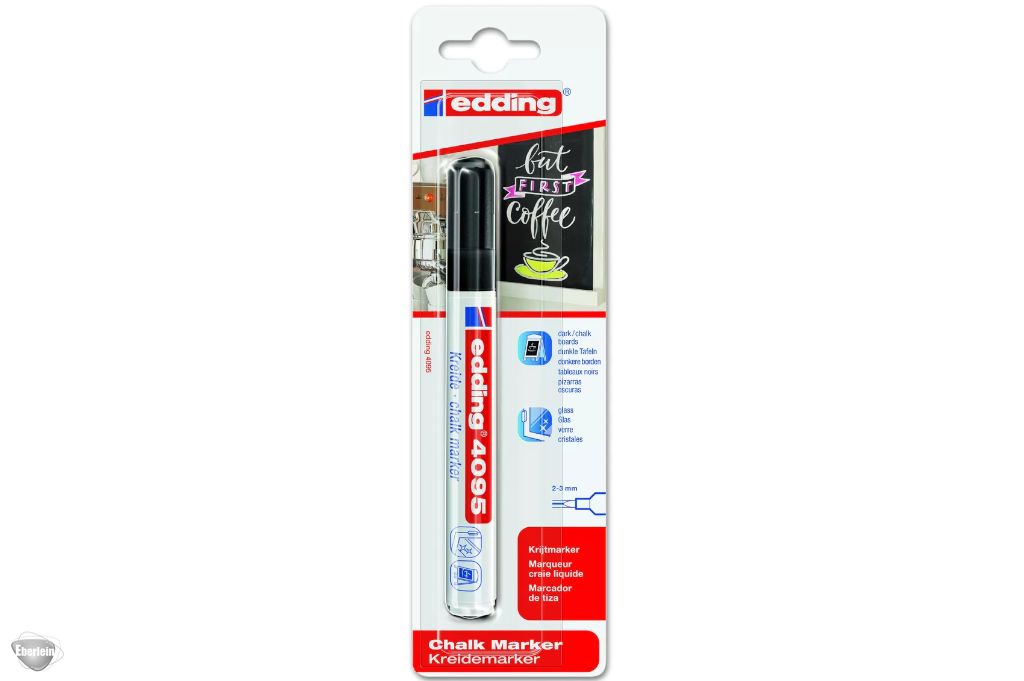 Kreidemarker edding 4095. Fenster-/ Kreidemarker zum Gestalten, Verzieren und Beschriften von Fenstern, Glas, Tafeln und anderen geschlossenen Oberflächen. Gut deckende, geruchsneutrale Flüssigkreide auf Wasserbasis. Feucht abwischbar von fast allen geschlossenen Oberflächen.