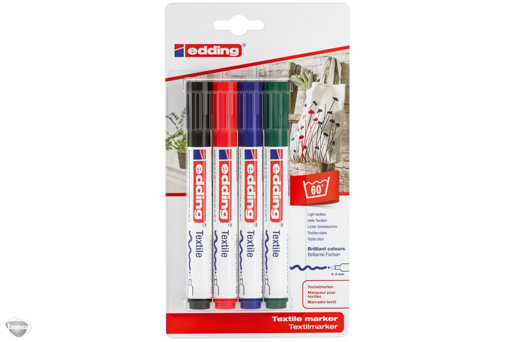 Textilmarker edding 4500 creative. Textilmarker zum Malen, Schreiben, Signieren auf fast allen appreturfreien Textilien. Rundspitze. Lichtbeständige, geruchsneutrale Pigmenttinte auf Wasserbasis. Zum Fixieren ohne Dampf bügeln. Nach dem Fixieren weitgehend waschfest bis 60°C. Weißer Kunststoffschaft. Umsteckbare Kappe in Schreibfarbe. Strichstärke: 2-3 mm. Schreibfarbe: sortiert schwarz, rot, blau, grün.