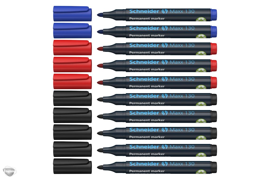 Der Permanent-Marker, der in keinem Werkzeugkoffer fehlen darf. Rundspitze, Strichstärke 1-3 mm. Schachtel mit 10 Stück: 5 x schwarz, 3 x rot, 2 x blau. *Gehäuse besteht aus 95% Recycling-Kunststoff, der innenliegende Tintenspeicher aus 75% Recycling-Fasern. Zum Beschriften von Karton, Papier, Kunststoff, Glas, Metall, Holz und fast allen anderen Materialien. Die Markierung ist schnelltrocknend, wasserfest und gut lichtbeständig. Die Cap-Off-Tinte trocknet nicht ein, auch wenn der Marker 2-3 Tage offen bleibt. Sie ist geruchsarm und frei von Toluol und Xylol. Der Marker hat eine praktische Clipkappe und ist nachfüllbar mit der Maxx 640 refill station.