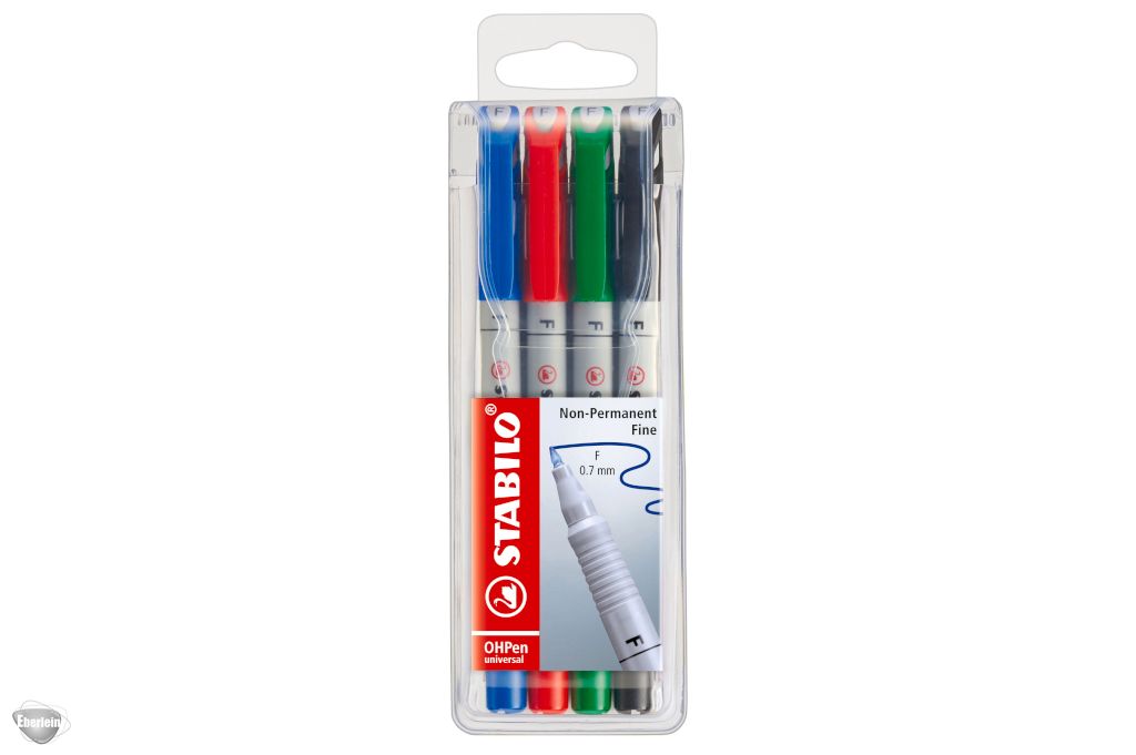 Der Folienstift STABILO OHPen universal wasserlöslich Fein im 4er Kunststoffetui in den Farben grün (36), rot (40), blau (41) und schwarz (46) mit der Strichbreite 0,7 mm.