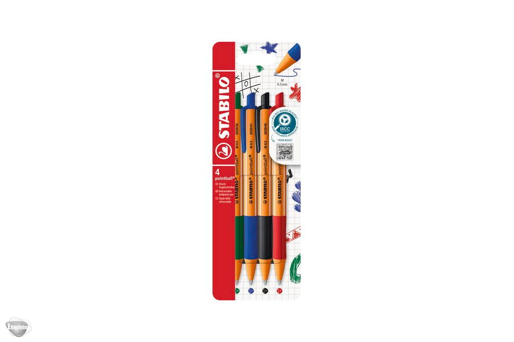 Der Kugelschreiber STABILO pointball im 4er Kartonetui in den Farben: grün (36), rot (40), blau (41) und schwarz (46).
