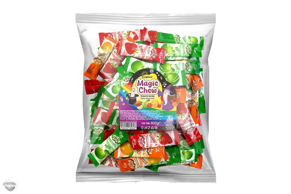 Lassen Sie sich verzaubern vom magischen Geschmack der Magic Chew Kaustreifen: fruchtig und bunt. In jeder Packung warten 100 Stück à ca. 8 g - perfekt portioniert für kleine Genussmomente. Ob als Wurfmaterial für Karneval und Fasching, als süße Füllung für die Pinata oder als Highlight auf jedem Kindergeburtstag: Diese Kaustreifen bringen Farbe, Spaß und ein Lächeln in jedes Event.