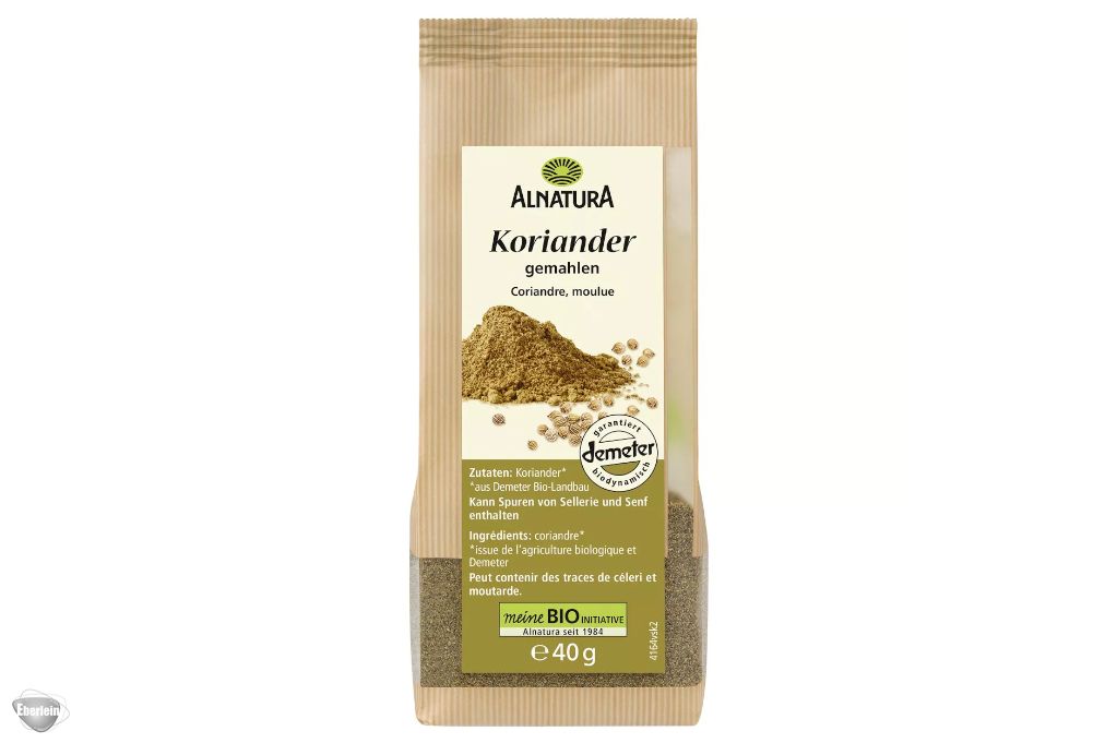 Koriander ist in den Küchen der Welt zu Hause, das würzig-nussige, leicht süßliche Aroma der kleinen Samen ist unverzichtbar in der indischen, thailändischen und arabischen Küche. Der Alnatura Koriander gemahlen stammt aus Demeter Bio-Landbau und schmeckt in pikanten Eintöpfen, Reis- und Gemüsegerichten und Chutneys genauso wie in süßen Speisen, etwa Kompott und Weihnachtsgebäck. Für intensiveres Aroma in der Pfanne ohne Fett kurz anrösten.