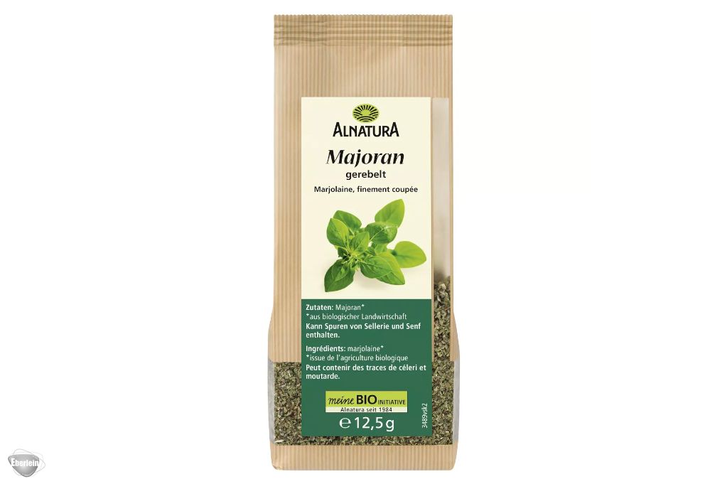 Majoran ist eng mit Oregano verwandt, schmeckt aber weniger herb. Als mediterranes Würzkraut verleiht er Suppen, Fleisch- und Eintopfgerichten eine aromatisch-kraftvolle Note, gibt aber auch Bratkartoffeln, Hirse und Reis ein typisches Aroma. Der Alnatura Majoran stammt aus Bio-Landwirtschaft und ist gerebelt, das heißt die getrockneten Blätter wurden von den Stielen abgestreift und zur bequemen Verwendung zerkleinert.