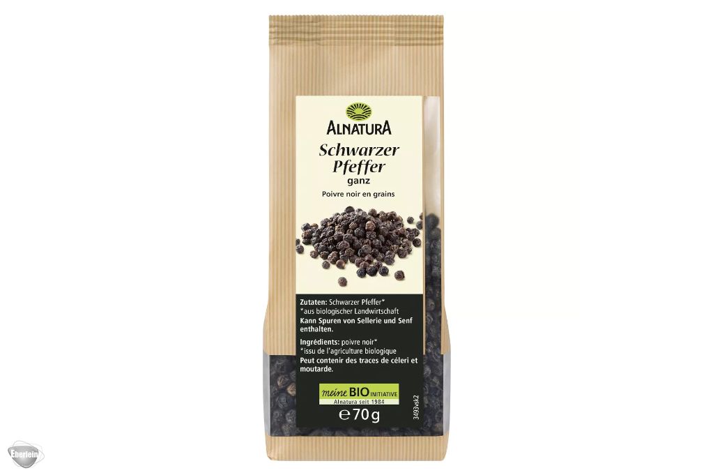 Pfefferkörner werden aus den getrockneten Beerenfrüchten des Pfefferstrauches gewonnen. Der Schwarze Pfeffer von Alnatura stammt aus Bio-Landwirtschaft und hat eine aromatische, leicht zitronige Schärfe – das passt zu fast allen herzhaften Speisen wie Fleisch, Suppen, Eintöpfen oder Salaten. Dazu den Pfeffer mitkochen oder frisch gemahlen über die fertigen Speisen geben. Tipp: Fruchtig-süßen Gerichten kann Pfeffer eine pikante Note geben.