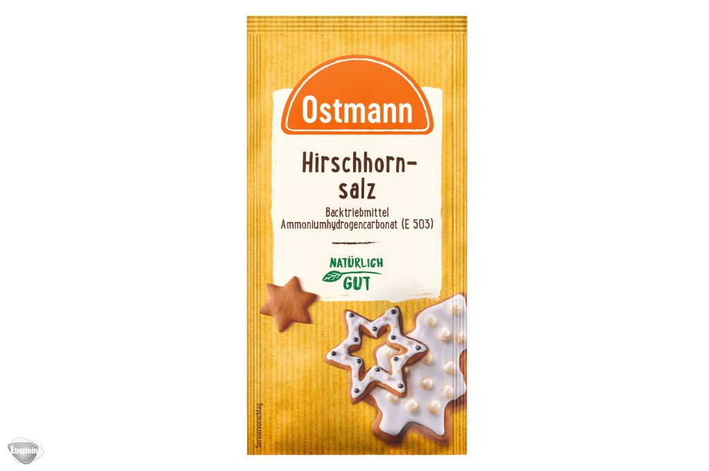 Ostmann Hirschhornsalz ist ein stark wirkendes Backtriebmittel mit charakteristischem Geschmack, das bei Temperaturen im Backofen bei über 60 °C seine Lockerungswirkung entwickelt. Es wird meist zusammen mit Pottasche für Flachgebäck eingesetzt. Neben der typischen Verwendung in der süßen Weihnachtsbäckerei, z. B. für Honig- und Lebkuchen, kann es aber auch in pikanten Flachgebäcken verarbeitet werden.