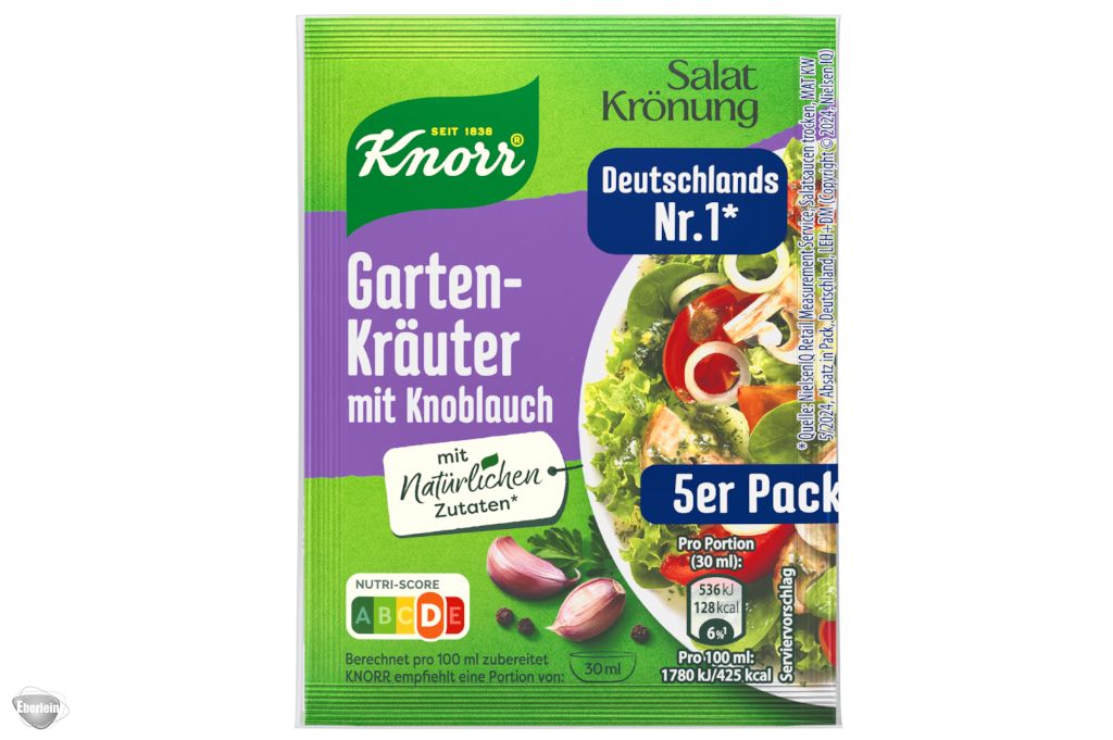 Knorr Salatkrönung Gartenkräuter-Knoblauch: Eine milde Knoblauchnote verleiht dem Klassiker aus verschiedenen Kräutern den richtigen Pepp. So wird aus einem appetitlichen Salat ein kulinarisches Highlight. Knorr Salatkrönung enthält sorgfältig ausgewählte Kräuter, die durch Trocknung haltbar gemacht werden.