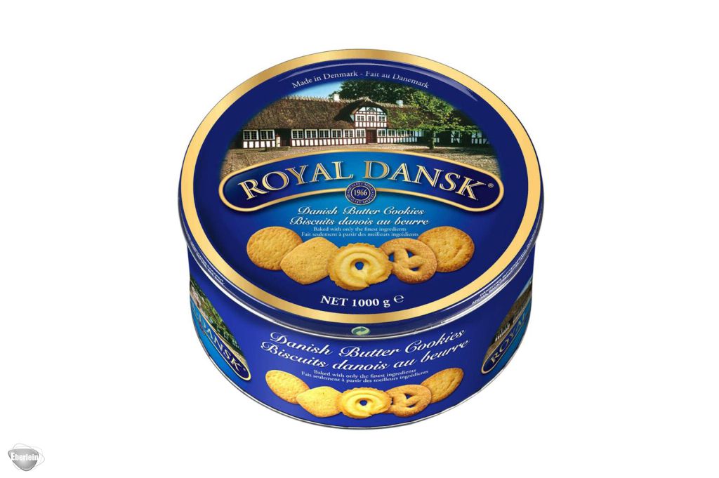 Original Dänische Butterkekse in 5 unterschiedlichen Formen und teilweise mit Zucker bestreut in einer dekorativen Metalldose.