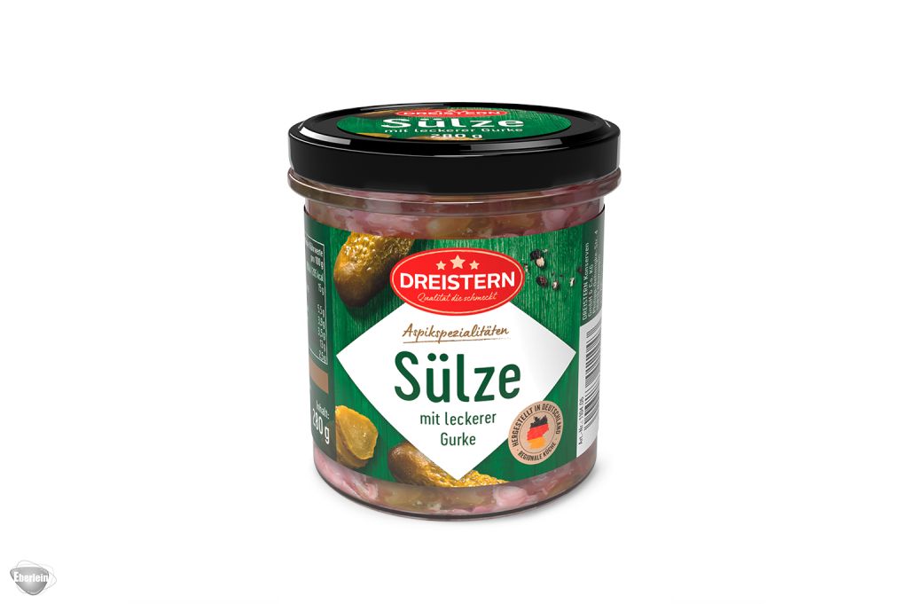 Frisch und herzhaft zugleich: Die Dreistern Sülze mit Gurke kombiniert feine Fleischsülze mit knackigen Gurkenstückchen. In der 280g-Packung ein leichter Klassiker, der als Brotbelag oder kleine Mahlzeit für erfrischenden Genuss sorgt.