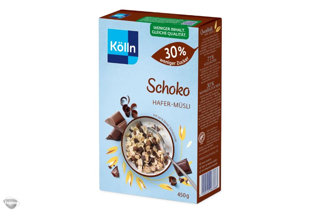Schoko-Müsli ohne Zuckerrausch? Das geht! Den Klassiker gibt es jetzt in einer Variante mit weniger Zucker - aber mit genauso viel Schoko-Genuss. Die Rezeptur basiert auf dem beliebten Original: Feine Zartbitterschokolade trifft auf cremige Vollmilchschokolade und vereint sich mit blütenzarten und kernigen Köllnflocken.