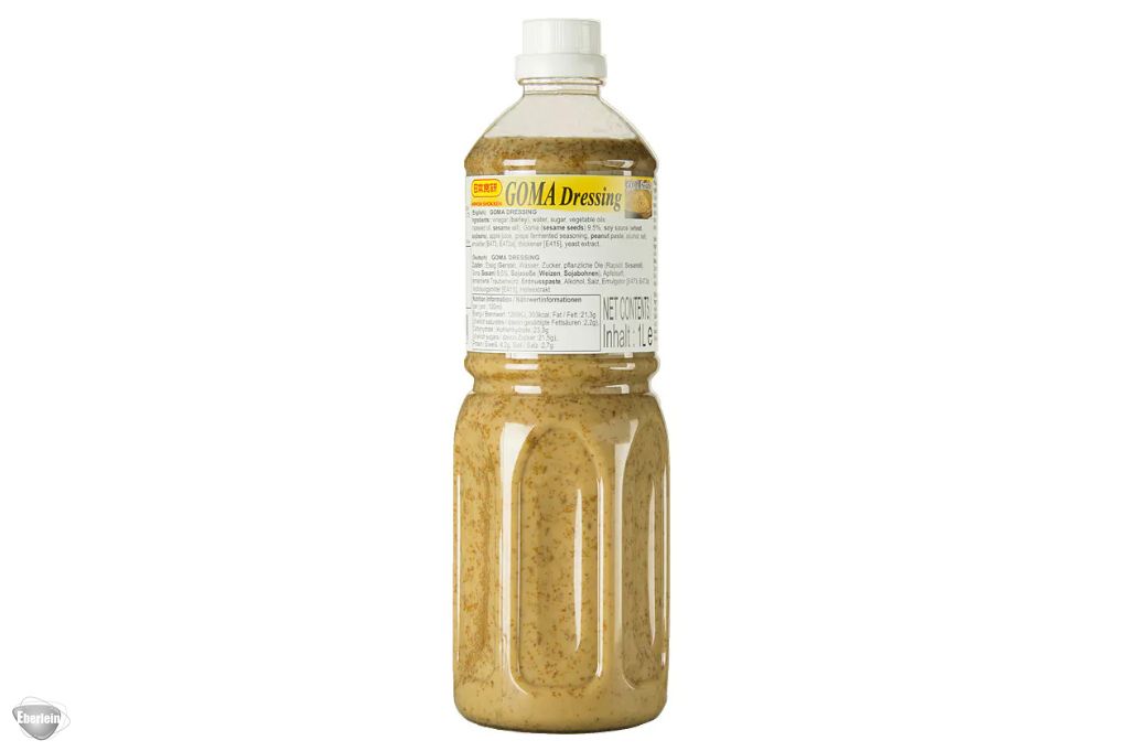 Essig (GERSTE), Wasser, Zucker, pflanzliche Öle (Rapsöl, SESAMÖL), Goma (SESAM) 9,5%, Sojasoße (WEIZEN, SOJABOHNEN), Apfelsaft, fermentierte Traubenwürz, ERDNUSSPASTE, Alkohol, Salz, Emulgator [E473, E472a], Verdickungsmittel [E415], Hefeextrakt
