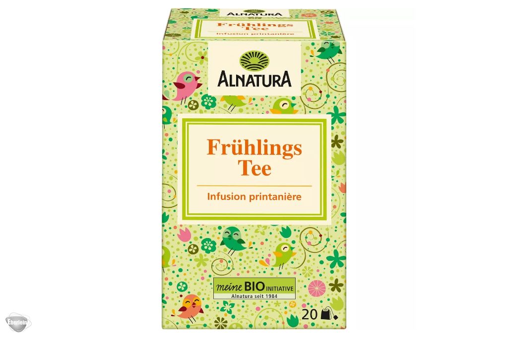 Perfekt für die Frühlingszeit: minzig-frische Bio-Kräuterteemischung mit Zitronengras, Himbeerblättern, Zitronenverbene und weiteren Kräutern. In jeder Packung Alnatura Frühlingstee befinden sich 20 Aufgussbeutel.