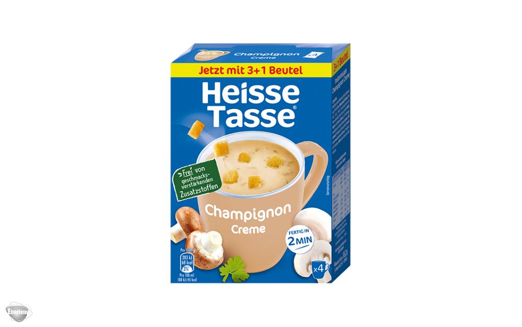 Gesucht und gefunden: Erasco Heisse Tasse Champignon Creme ist eine feine Cremesuppe mit leckeren Champignon-Stückchen und Knusper-Croûtons. Ideal für den kleinen Genuss zwischendurch.