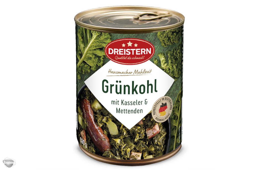 Deftig und herzhaft: Der Dreistern Grünkohl mit Kasseler & Mettenden vereint würzigen Kohl mit zartem Kasseler und kräftigen Mettenden. In der 800g-Packung ein vollwertiges Gericht, das Tradition und Sättigung in einer Portion vereint.