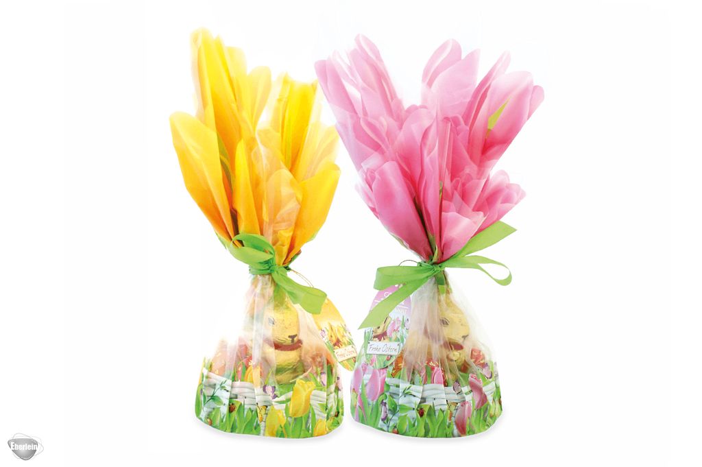 Geschenkverpackung mit Osterhasen-Hohlfigur aus Alpenvollmilch-Schokolade und gefüllten Ostereiern aus Vollmilch-Schokolade, 3-fach sortiert. Mit Grußfeld.