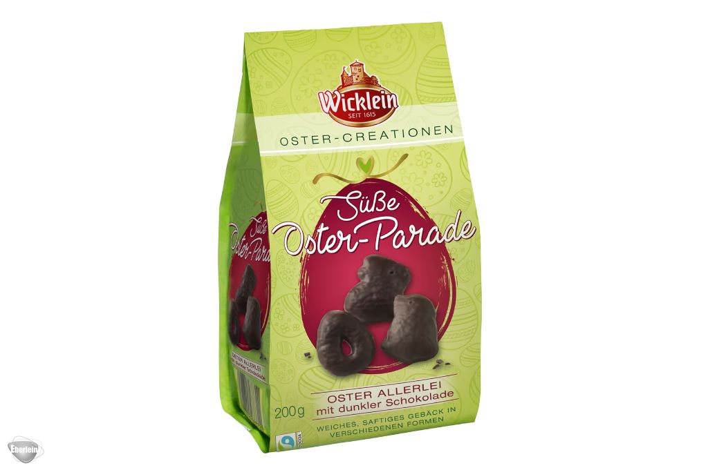 Weiches, saftiges Gebäck in verschiedenen Formen, überzogen mit bester dunkler Schokolade: Diese Wicklein-Spezialität aus der neuen Oster-Creation bereichert jedes Osternest und ist optisch und geschmacklich ein besonderer Frühlings-Genuss für die ganze Familie.