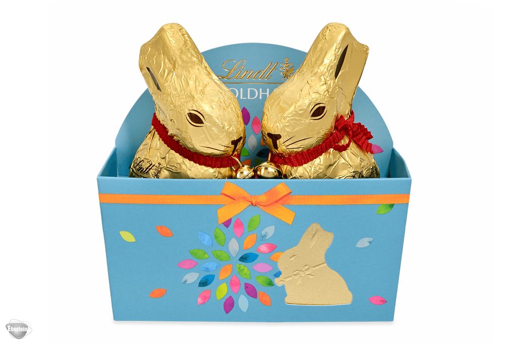 Osterpräsent mit 2 Lindt Goldhasen und österlichen Schokoladenspezialitäten