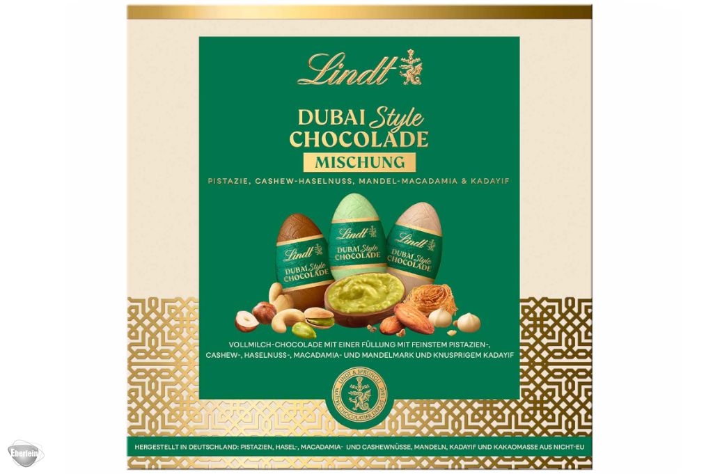 Die Lindt Dubai Style Chocolade Eier Mischung vereint drei exquisite Sorten in einer eleganten Geschenkbox: