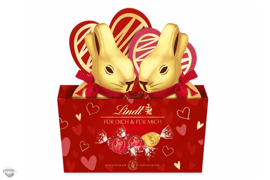 Geschenkverpackung mit 2 Original Lindt Goldhasen und einzeln gewickelten Lindor Eiern in den Sorten Milch und Weiss