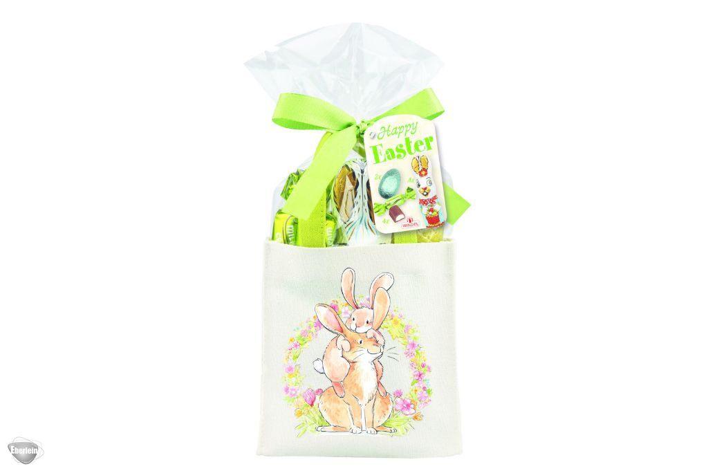 Tasche aus Baumwolle, gefüllt mit einem Vollmilch Osterhasen, Schokoladeneiern und Schokopralinen mit Milchcremefüllung