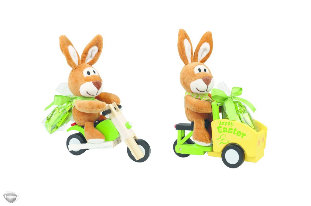 Holzspielzeug mit Plüschhase mit 4 Bonbons aus Vollmilchschokolade mit Milchcremefüllung