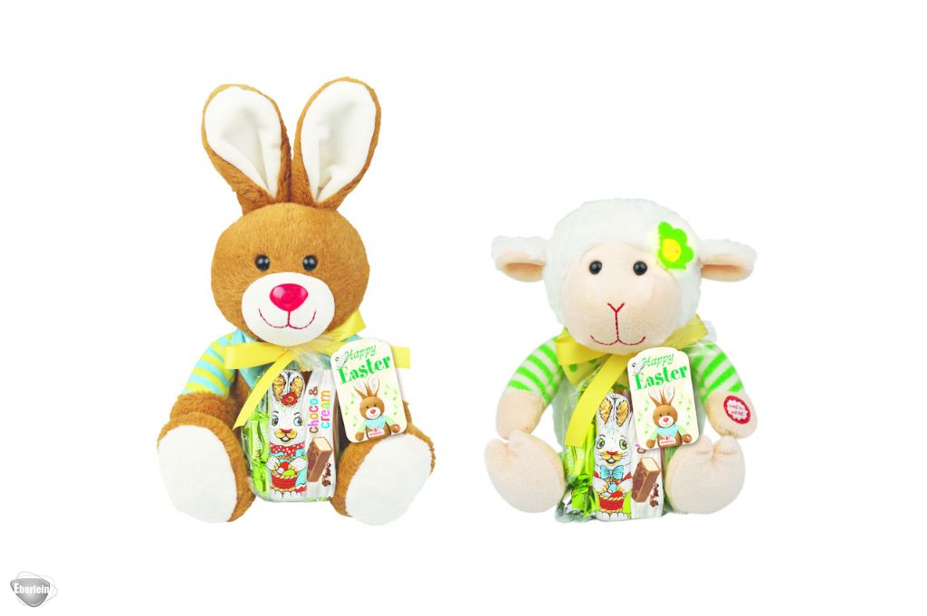 Hase und Schaf sortiert mit 80 g Schokolade, auf Knopfdruck blinkt die Blume oder die Nase und es ertönt ein lustiges Lied, inklusive Batterien