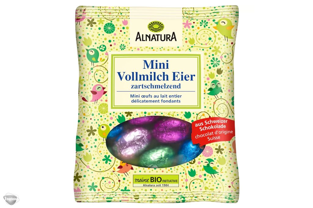 Süße Mini-Eier aus zartschmelzender Schweizer Bio-Vollmilchschokolade: Die Alnatura Mini-Vollmilch-Eier sind einzeln verpackt und damit perfekt als bunte Kleinigkeit im Osterkörbchen.