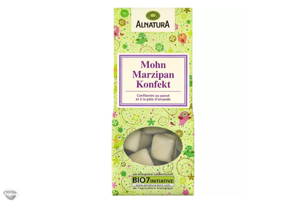 Ein Bio-Konfekt exklusiv zur Frühlingszeit: Aromatisches Mandelmarzipan wird mit Mohn verfeinert und mit weißer Schokolade überzogen.