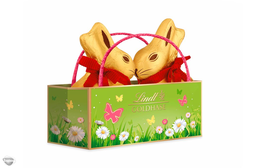 Überraschen Sie Ihre(n) Liebste(n) zu Ostern doch mit der Lindt Oster-Freuden Goldhasen Tasche. In der frühlingshaften Transporttasche sitzen zwei niedliche, ca. 9 cm große Osterhasen-Hohlfiguren aus köstlicher Alpenvollmilch-Schokolade, die ihre Nasen zum Kuss berühren. In gewohnter Goldhasen-Manier tragen sie ein rotes Band mit Glöckchen um den Hals und sehen zum Anbeißen süß aus.