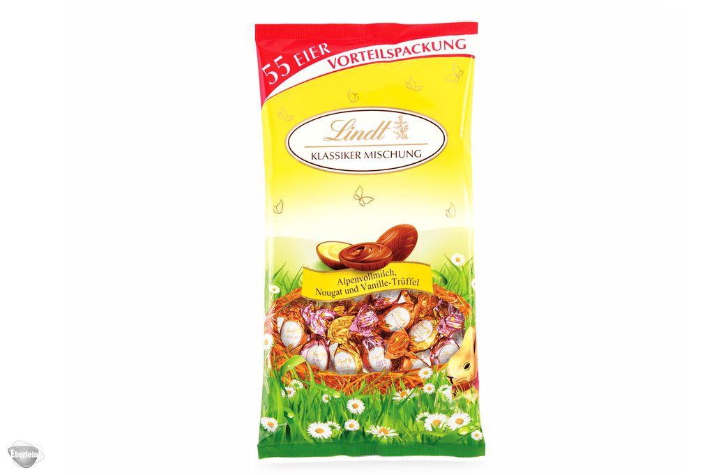 Mischung aus 55 einzeln gewickelten Eiern aus Alpenvollmilchschokolade, teilweise gefüllt. 3-fach sortiert.