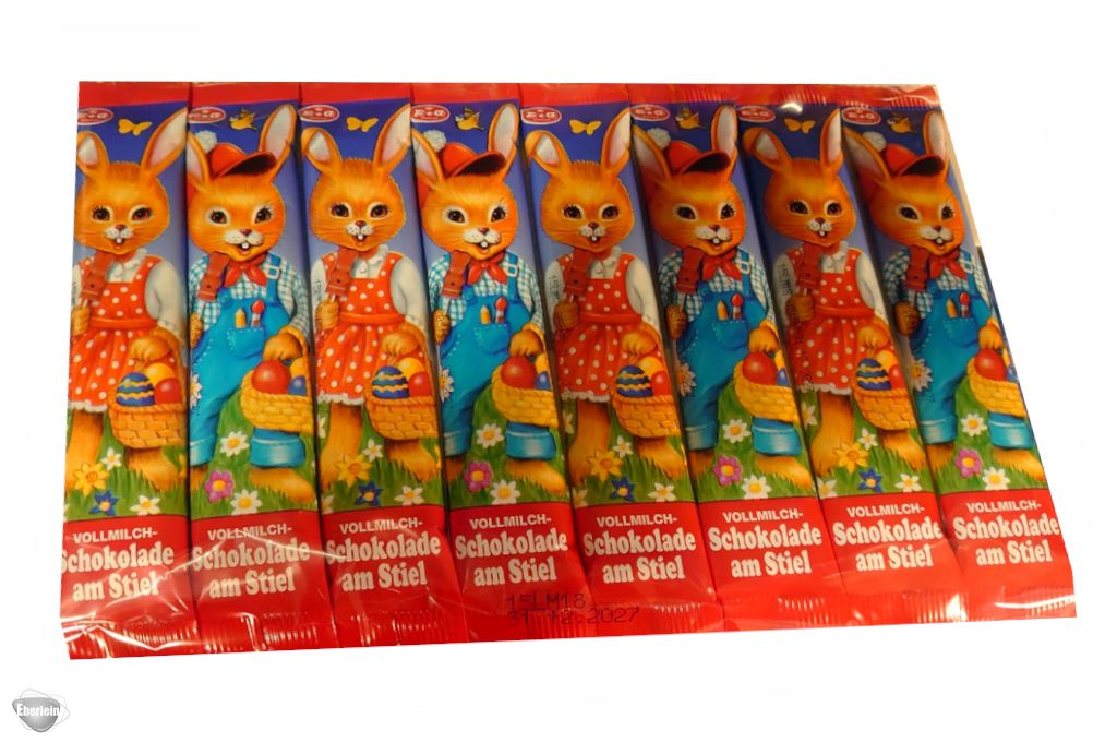 8 einzeln verpackten Lollis in Osterhasenform aus Vollmilch-Schokolade