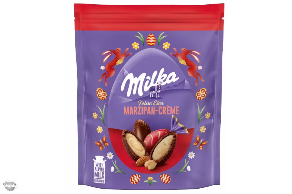 Milka Feine Eier Marzipan bestehen aus einer Füllung aus saftigem, feinstem Marzipan und sind umgeben von zartherber Alpenmilch-Schokolade. Diese köstliche Komposition wird Sie verführen und in zartschmelzenden Träumen schwelgen lassen, wenn Sie die Pralinen in der Osterzeit in Osternestern verstecken oder sie ganz für sich genießen.