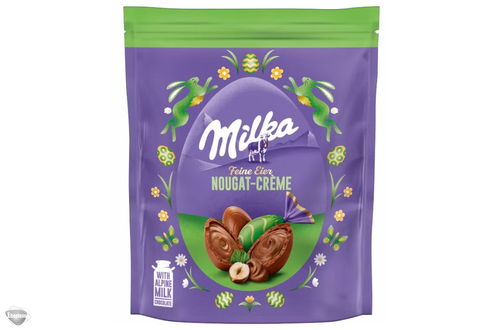 Milka Feine Eier Nougat-Crème sind für Nougat-Liebhaber zu Ostern genau das Richtige. Denn die Ostereier aus feinster Alpenmilch-Schokolade sind mit einer köstlichen Nougat-Crème gefüllt, die das zartschmelzende Geschmackserlebnis perfekt abrundet.