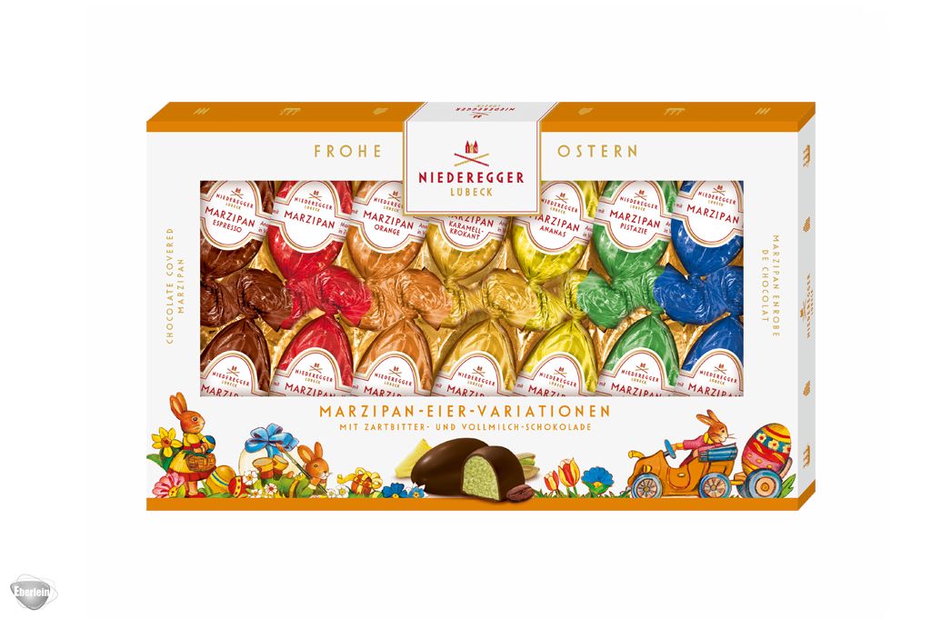 Köstliches Niederegger Marzipan in edler Osterei-Form – unsere vielfältigen Marzipan Eier in den sieben Sorten »Classic«, »Vollmilch«, »Orange«, »Karamell-Krokant«, »Ananas«, »Pistazie« und »Espresso« umhüllt von knackiger Zartbitter- oder Vollmilch-Schokolade im 175g-Format sorgen für festliche Stimmung auf Ihrem Ostertisch und sind die perfekten Begleiter für ein genussvolles Fest. Ob als besondere Geschenkidee oder dekorative Nascherei – diese hochwertigen Köstlichkeiten machen Ihr Osterfest zu etwas ganz Besonderem und sind ideal für alle Marzipanliebhaber die hochwertigen Genuss und liebevolle Ostertraditionen schätzen.