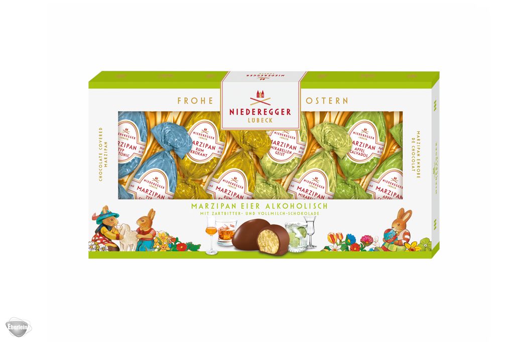 Köstliches Niederegger Marzipan in edler Osterei-Form – unsere vielfältigen alkoholischen Marzipan Eier in den vier Sorten »Gin Tonic«, »Rum-Krokant«, »Mirabellengeist« und »Apfel-Calvados« umhüllt von knackiger Zartbitter- oder Vollmilch-Schokolade im 100g-Format sorgen für festliche Stimmung auf Ihrem Ostertisch und sind die perfekten Begleiter für ein genussvolles Fest. Ob als besondere Geschenkidee oder dekorative Nascherei – diese hochwertigen Köstlichkeiten machen Ihr Osterfest zu etwas ganz Besonderem und sind ideal für alle Marzipanliebhaber die hochwertigen Genuss und liebevolle Ostertraditionen schätzen.