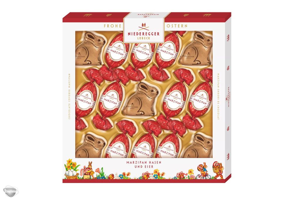 Ostervariationen zum Verschenken - diese edlen Niederegger Marzipan Hasen kombiniert mit sieben köstlichen Eiersorten, überzogen mit knackiger Zartbitterschokolade, sind das perfekte Geschenk oder Mitbringsel zum Osterfest. Diese liebevoll arrangierte Geschenkverpackung vereint hochwertigen Genuss mit traditionellem Charme und eignet sich perfekt, um den Liebsten eine süße Freude zu bereiten.