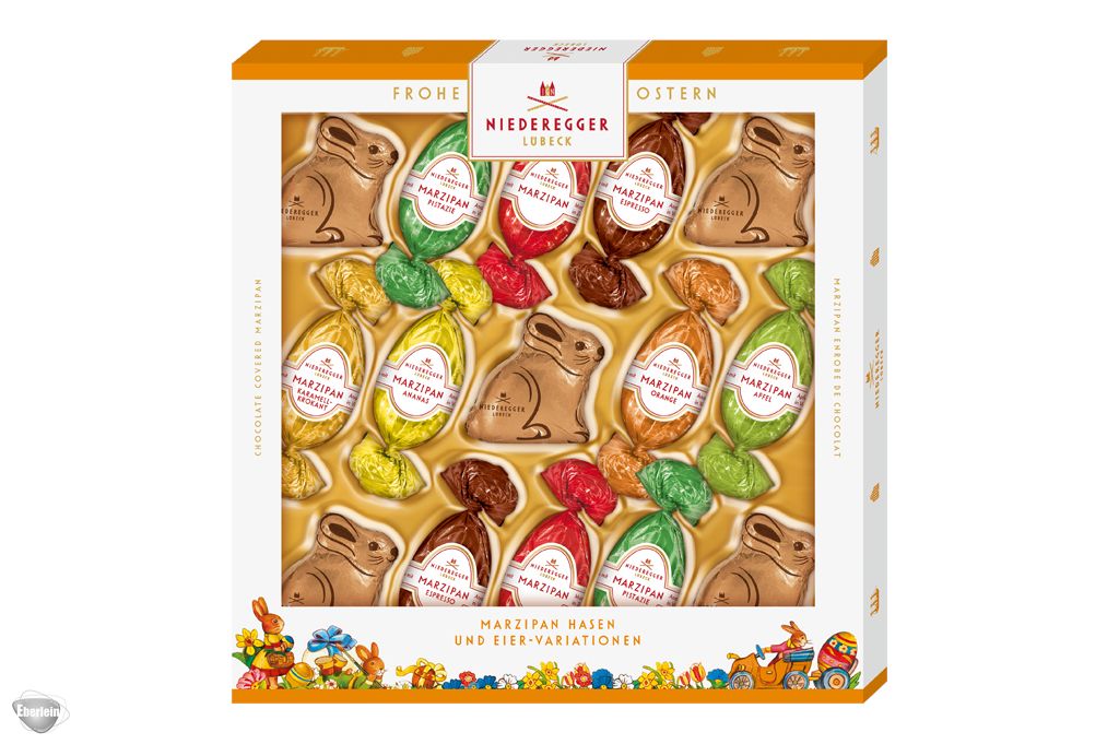Ostervariationen zum Verschenken - diese edlen Niederegger Marzipan Hasen kombiniert mit sieben köstlichen Eiersorten, überzogen mit knackiger Zartbitter- oder Vollmilchschokolade, sind das perfekte Geschenk oder Mitbringsel zum Osterfest. Diese liebevoll arrangierte Geschenkverpackung vereint hochwertigen Genuss mit traditionellem Charme und eignet sich perfekt, um den Liebsten eine süße Freude zu bereiten.