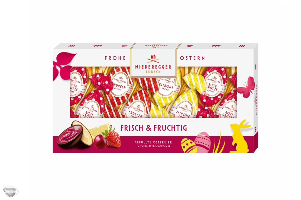 Fruchtig-frische Niederegger Pralinen Eier – unsere köstlichen Ostereier in den drei fruchtigen Sorten »Zitronen-Creme«, »Erdbeer-Creme« und »Rote-Grütze-Creme« im 100g-Format sind die ideale Überraschung für die Ostertage. Frische Cremefüllungen mit intensiv fruchtigen Noten, umhüllt von zartschmelzender Zartbitter-Schokolade, verleihen diesen Ostereiern ihren unverwechselbaren Geschmack. Ob als liebevolles Geschenk oder zum selbst Genießen – diese feine Ostermischung verspricht ein besonderes Geschmackserlebnis für alle Sinne.