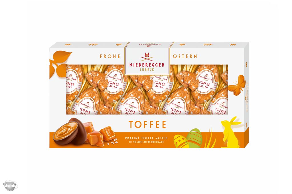 Köstliche Niederegger Pralinen Eier – unsere Ostereier in der beliebten Sorte »Toffee-Salted« im 100g-Format lassen das Karamell-Herz höherschlagen. Umhüllt von zarter Vollmilch-Schokolade ist die schmackhafte Pralinencreme, verfeinert mit Salz, ein vollmundiger Genuss. Ob als liebevolles Geschenk oder zum selbst Genießen – diese besonderen Pralinen sorgen für ein intensives Geschmackserlebnis.