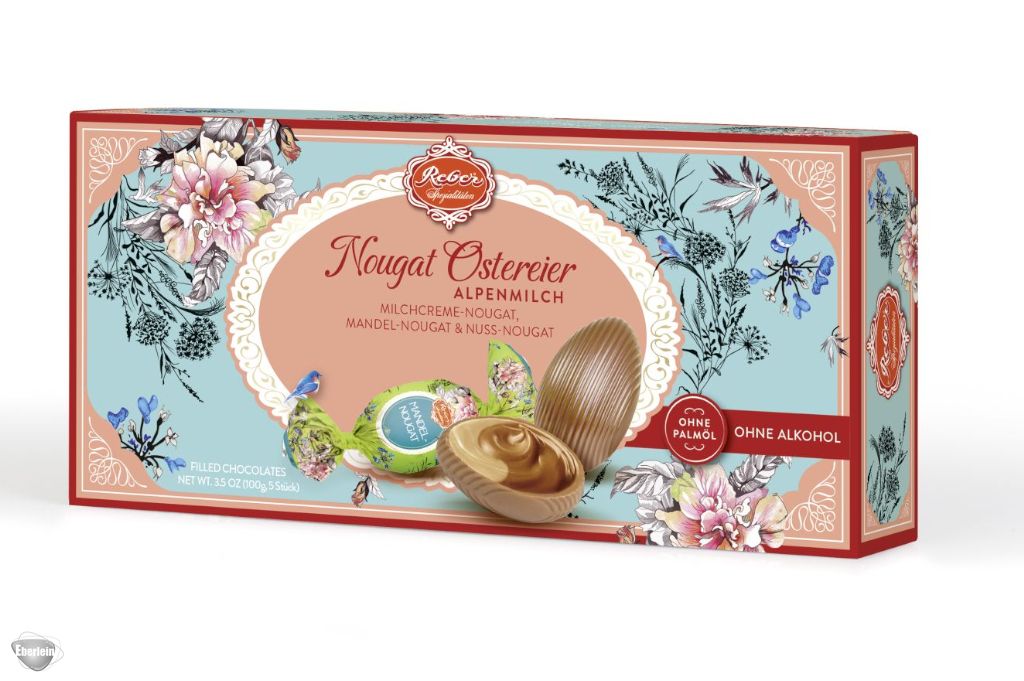 Verwöhnen Sie sich mit den exklusiven Nougat-Ostereiern von Reber – ein wahres Meisterwerk der Confiseriekunst. Diese edlen Ostereier vereinen die Aromen von zartem Mandel-Nougat, intensivem Nuss-Nougat und dem einzigartigen Milchcreme-Nougat Ei, das in feinster Schokolade gehüllt ist.