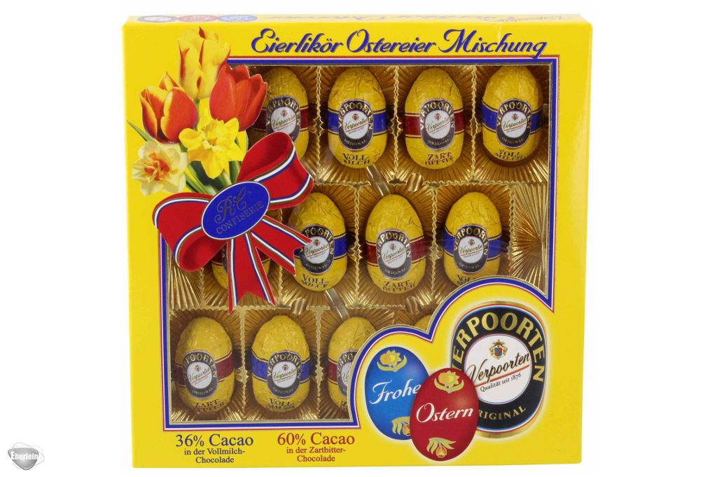 Genießen Sie mit der Eierlikör-Ostereier-Mischung von Verpoorten ein besonders genussreiches Osterfest. Aus feinster Vollmilch- und Zartbitterschokolade hergestellt und gefüllt mit bestem Verpoorten Eierlikör, bieten diese kleinen Osterüberraschungen Genuss der ganz besonderen Art. Die Verpoorten Eierlikör-Ostereier-Mischung ist ein wunderbares Geschenk zu Ostern, eignet sich auch hervorragend zum Anbieten für Gäste oder einfach zum Selbernaschen.