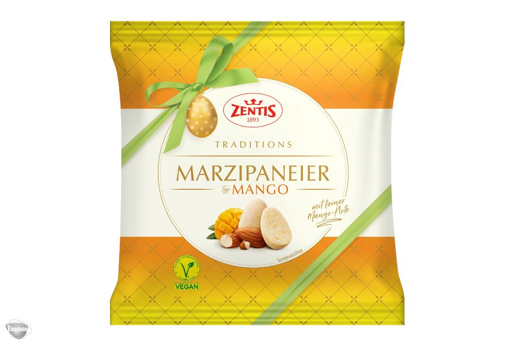 Zentis Marzipan‑Eier Mango vereinen zartes Marzipan mit einer fruchtig‑exotischen Mango‑Note und sorgen so für ein angenehm leichtes, frühlingshaftes Geschmackserlebnis. Die kleinen, veganen Köstlichkeiten schmelzen sanft auf der Zunge und bringen als süße Abwechslung frische Farbe ins Osternest.