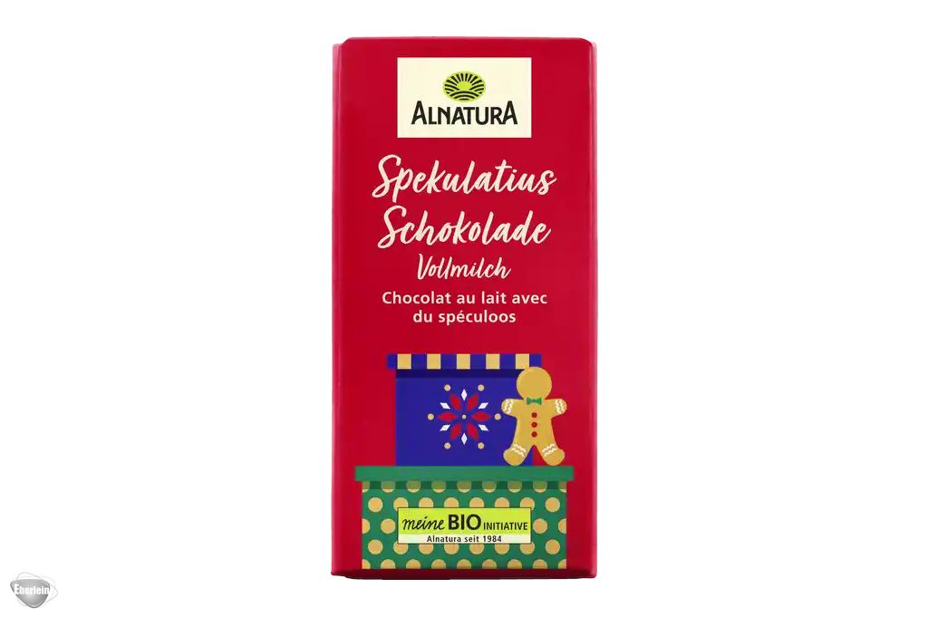 Vollmilchschokolade und knusprig-würzige Spekulatiusstückchen vereinen sich zu einem winterlichen Bio-Naschvergnügen. Die Alnatura Spekulatius-Schokolade wird ohne Lecithine hergestellt.
