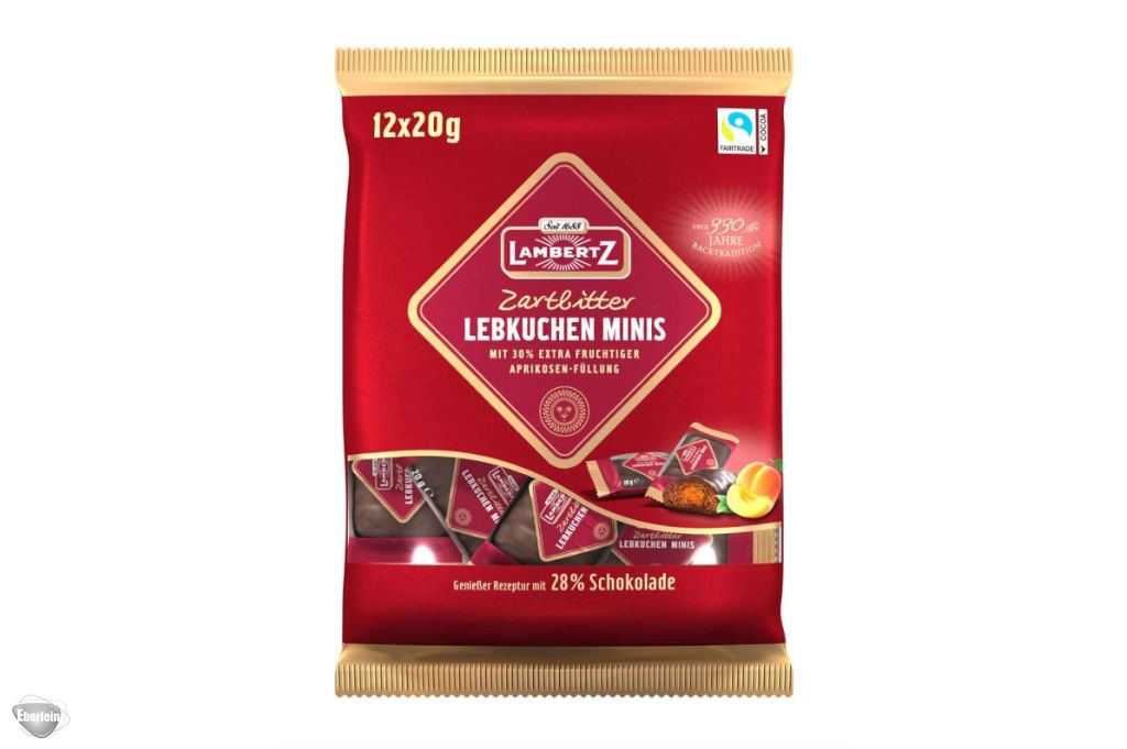 Die Lambertz Lebkuchen Minis sind der kleine, aber feine Genuss für die Weihnachtszeit. Die mundgerechten Stückchen überzeugen mit ihrem würzig-aromatischen Lebkuchenteig und einem fruchtigen Kern aus Aprikosenfüllung, der sie besonders saftig macht. Ein Überzug aus edler Zartbitterschokolade rundet den Geschmack perfekt ab und macht die Minis zu einem unwiderstehlichen Highlight der Adventszeit. Ob zum Kaffee, Tee oder als süße Kleinigkeit zwischendurch - diese Leckerbissen versprechen süße Genussmomente und wecken Kindheitserinnerungen.