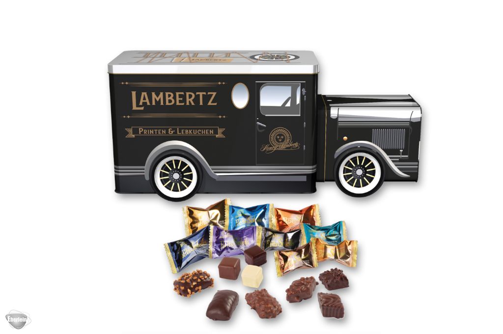 Liebevolle Nachbildung eines Original Lambertz Lieferwagens im 30er-Jahre Retro Design mit detailreicher Prägung