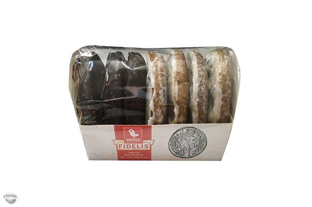 Weiss Fidelis: Lebkuchen-Mix aus mit Zuckerguß glasierten und mit 12% Zartbitterschokolade schokolierten Oblaten-Lebkuchen.