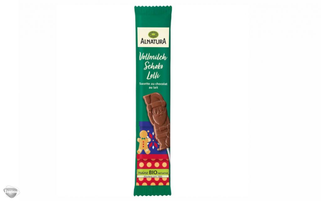 Dieser kleine Mann versüßt die Adventszeit: Der Alnatura Vollmilch-Schoko-Lolli hat die Form eines Weihnachtsmanns; am Papierstiel ist er für große und kleine Hände gut zu greifen, ohne dass die Finger klebrig werden. Die hochwertige Bio-Vollmilchschokolade schmilzt zart auf der Zunge – ideal zum Selber-Genießen oder als kleines Geschenk im Adventskalender oder Nikolausstiefel.