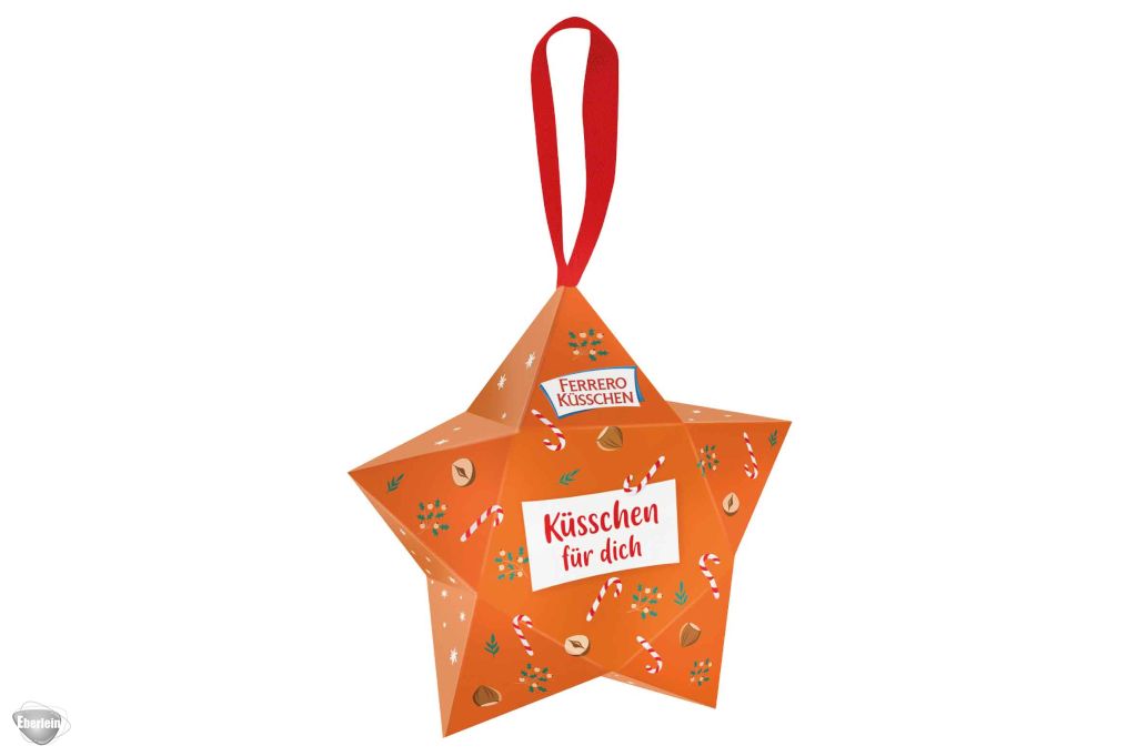 Eine knackig geröstete Haselnuss umhüllt von feiner Schokolade. Durch die sorgfältige und schonende Röstung erhalten die auserlesenen Nüsse das unverwechselbare Aroma, das Ferrero Küsschen ausmacht. Die feinen Nuss-Splitter sorgen dafür, dass Ferrero Küsschen so knackig-nussig schmecken. Durch das sternförmige Design eignet es sich perfekt als Christbaumschmuck.