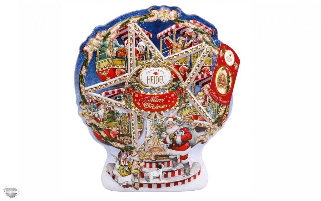 Weihnachtliche Erinnerungen an eine vergangene Zeit. Die schöne Heidel 'Weihnachts-Nostalgie' Riesenrad Schmuckdose ist das ideale Geschenk für echte Nostalgiker. Die geprägte Metalldose hat die Form eines alten Riesenrads und wurde aufwendig mit einem nostalgischen Weihnachtsmotiv ausgestaltet. Die einzigartige Optik macht sie im Dezember zu einem dekorativen Hingucker. In dem Inneren der Dose befinden sich feinste Pralinen aus edler Vollmilchschokolade, die mit einer zartschmelzenden Pralinencreme gefüllt sind. Für eine besinnliche Weihnachtszeit voller Genuss.